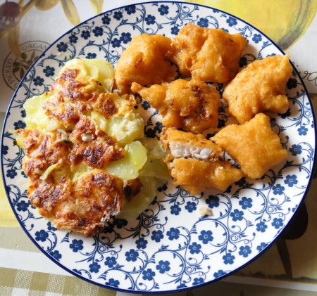 Seelachs Kibbbeling an Zuchiniauflauf. Backfischpanade s.o.