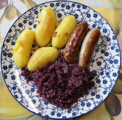 Eisbein, Karoffelpüree, Weinsauerkraut + Schuss WeißweinMädchentraube lieblich mit kleinen Speckwürfeln