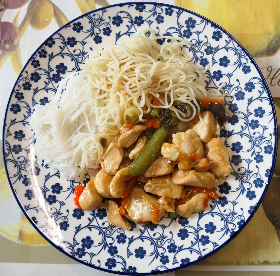 Hähnchenbrustfilet geschnitten, asiatische Gemüsemischung TKKmit Chilisoße süß-sauer, Glas- und Mienudeln.