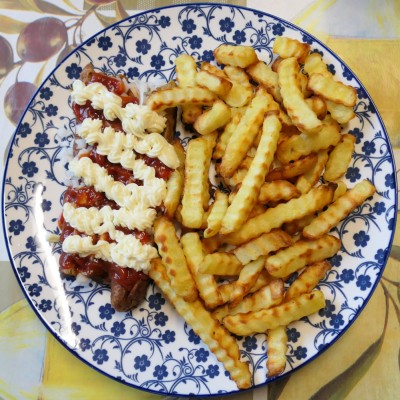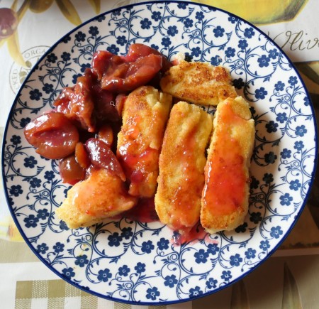 Grießschnitte paniert, Pflaumen aus dem Glas,Saft mit Tortenguss rot gebunden.