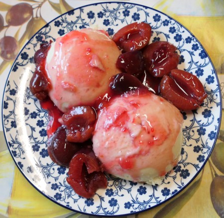 Fertige Hefeklöße mit Pflaumen. Saft mit Tortenguss rot gebunden.