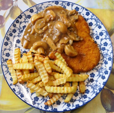 Fertiges Riesenschnitzel, Pommes aus der Heiußluftfriteuse, Pilzsoße.