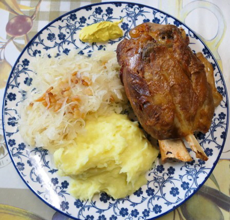 Eisbein, Karoffelpüree, Weinsauerkraut + Schuss WeißweinMädchentraube lieblich mit kleinen Speckwürfeln